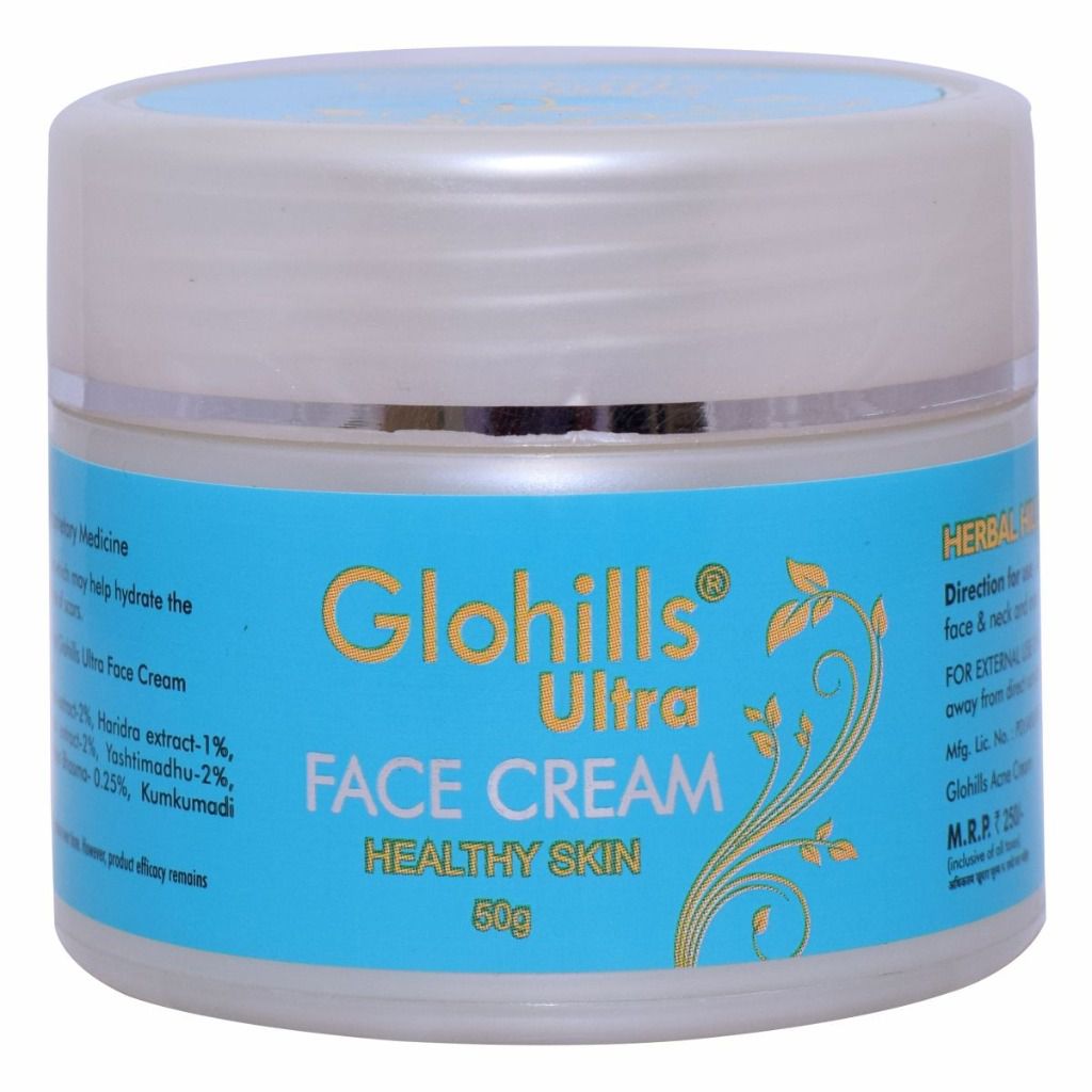 Glohills Ultra Face Cream (Healthy Face Cream) is a formulation of various herbs. These herbs are Shalmali, Nimba, Haridra, Sariva, Kumari, Yashtimadhu, Yashad Bhasma, Tankan Bhasma, and Kumkumadi tail. Through these ingredients, it may protect the skin and promote natural skin care. You may also use this face cream for daily use.