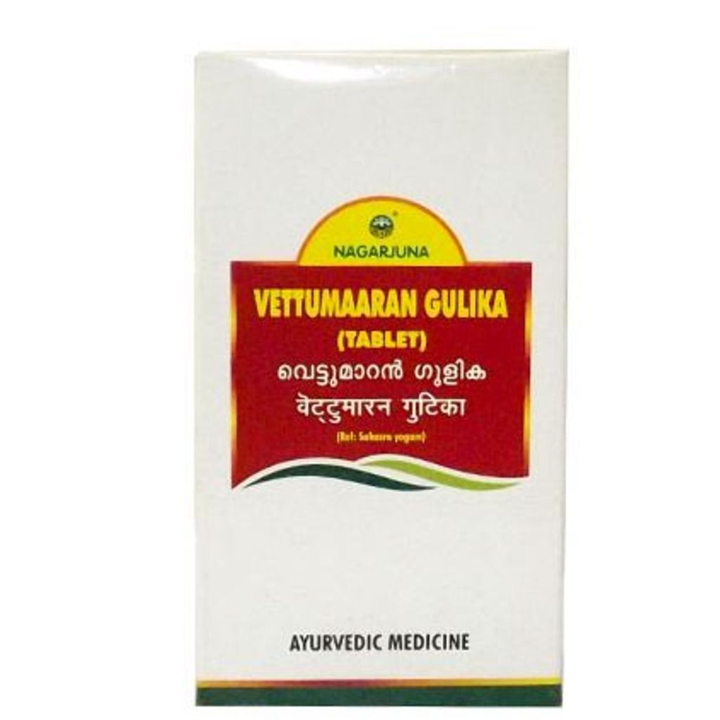 Nagarjuna ( Kerala ) Vettumaran Gulika used in Ayurvedic treatment of fever, vomiting, abdominal colic pain.